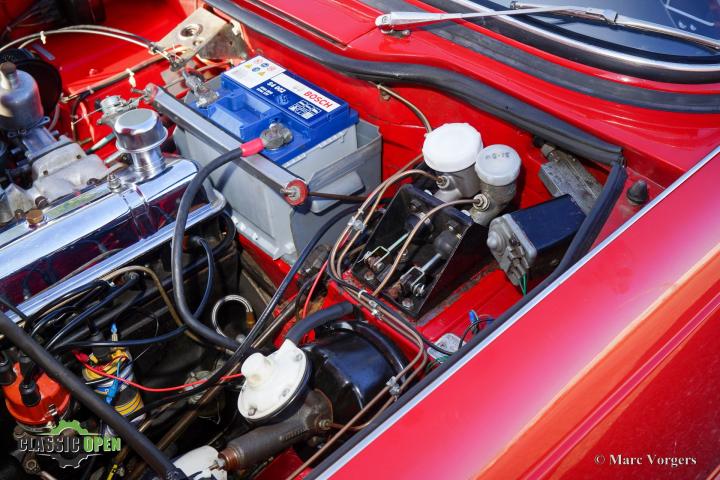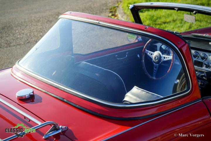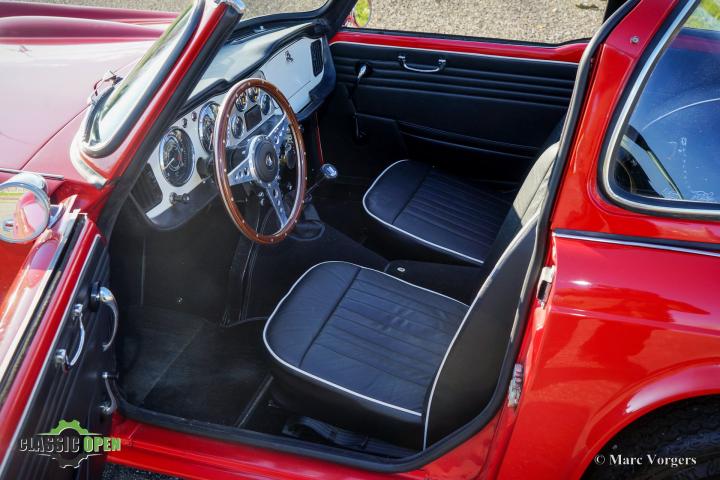 Kleur rood gecombineerd met een zwartlederen interieur afgewerkt met witte biezen en zwart tapijt. Deze prachtige Triumph TR 4 is uitgerust met een zeldzame originele ‘Surrey-top’. Hiervan heeft Porsche het ‘Targa’ dak afgekeken.