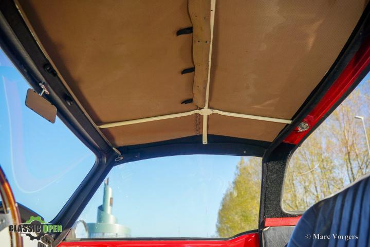 Het stoffen dakdeel met inklapbaar frame kan zeer compact in de kofferbak worden opgeborgen. Deze Triumph TR 4 is in het verleden gerestaureerd en de auto verkeert in een zeer goede tot excellente staat.