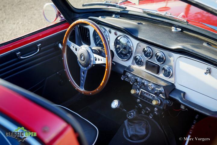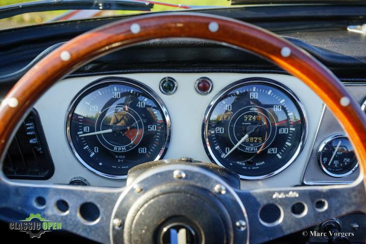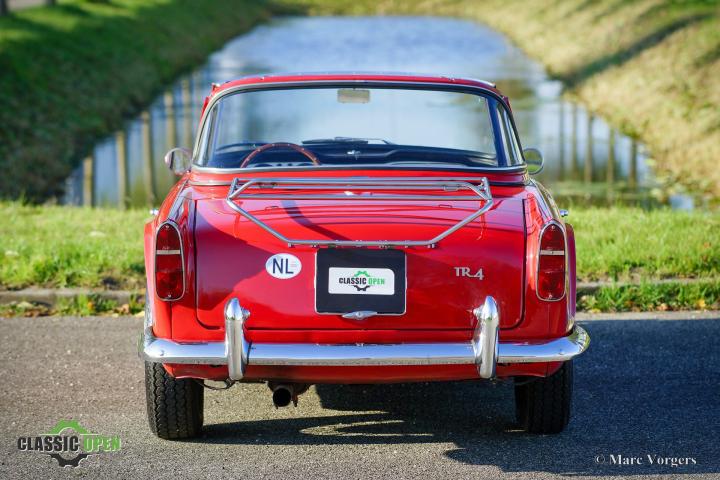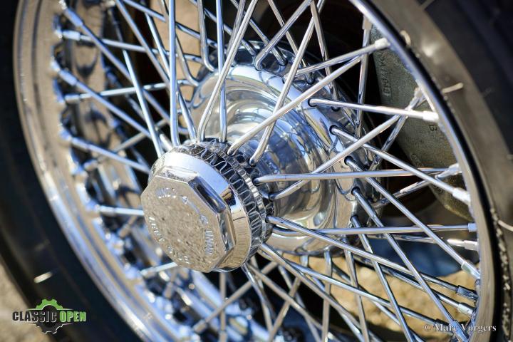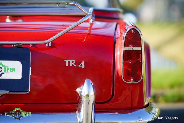 Deze TR 4 is uitgerust met alle ‘goodies’ die klassieke TR-liefhebbers op prijd stellen: een zeldzame ‘Surrey-top’, overdrive, een MotoLita-stuur met houten rand, chromen spaakwielen en een chromen bagagerek.