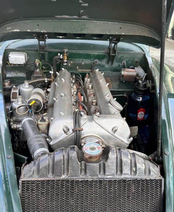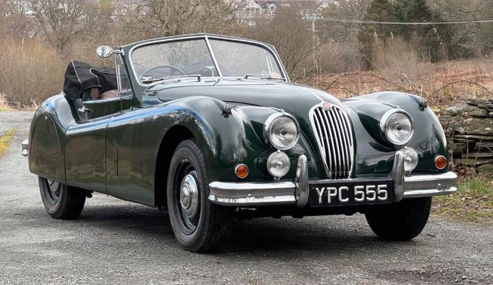A totally correct and exceptionally original example of a rare UK market, RHD drophead, supplied new in 1955 by The Woodcote Motor Co, Epsom. Sound condition, cosmetically mature and appealing, retaining original, mellowed tan leather interior, and of nicely understated specification with disc wheels and spats. The paint shows its age in a quite charming way, the chrome work is very good to excellent, and the overall appearance is seductively appealing. One owner from 1974 to 2015, and one since. Just 6,000 odd miles covered during those fifty years! Recent work has included a new stainless exhaust, new clutch, complete re-wire and a good deal more besides. Comes with a Jaguar heritage certificate confirming original specification and colour scheme, and a file of invoices from recent years showing parts expenditure, etc. Driving very nicely, sounding great, and fun to whizz around in! Very few survive in such undisturbed condition!