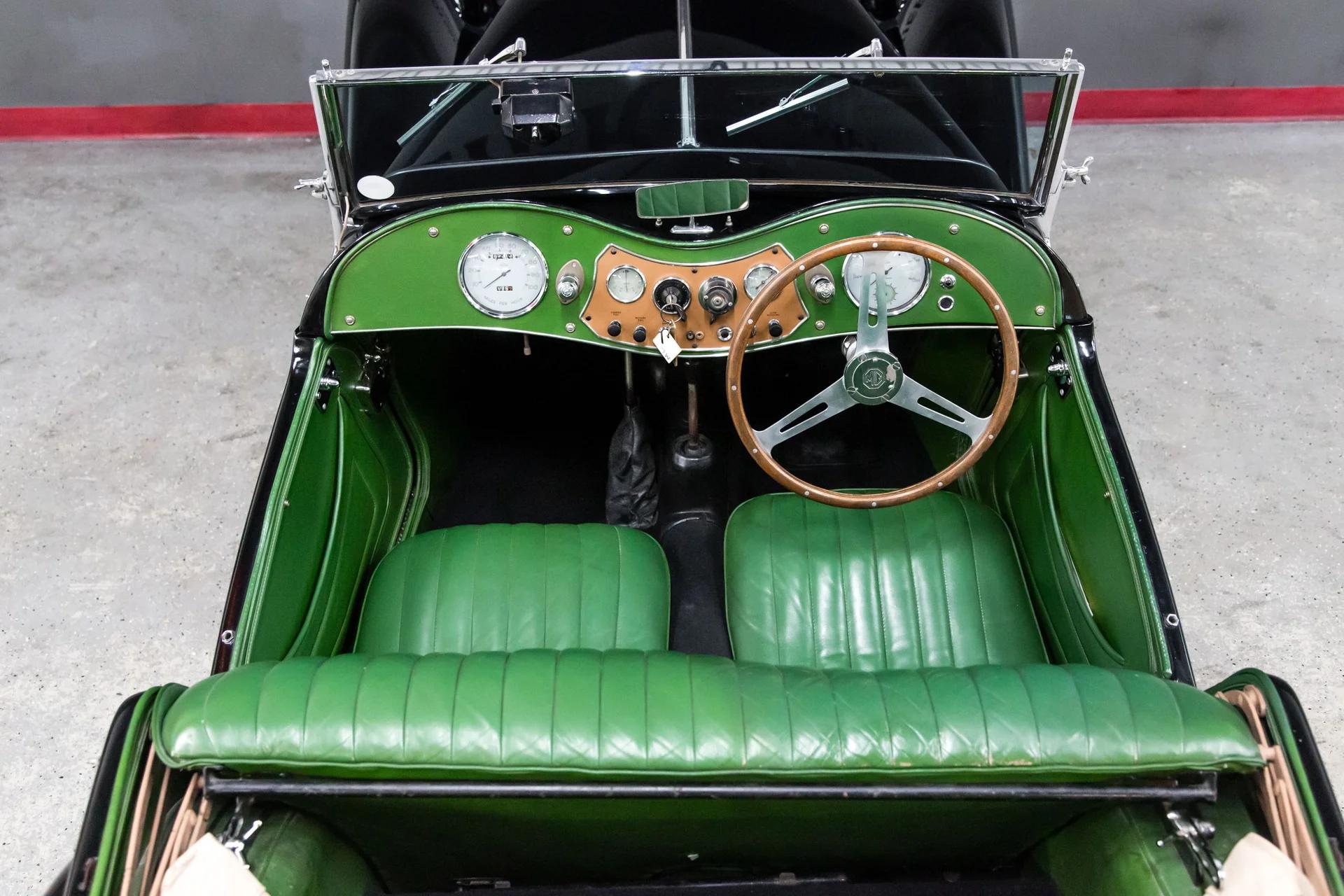 This beautiful black over green MGTC drives as nice as it looks. The car has excellent chrome ,nice leather, carpets, door cards ,and gauges .The paint is as nice as the pictures reflect. The wings are straight with no rust or accident history. The doors are tight ,wood in the tub is solid. The car hails from California and is not a victim of rust or accident history. The car will come with a new top or credit will be given for your choice of color.