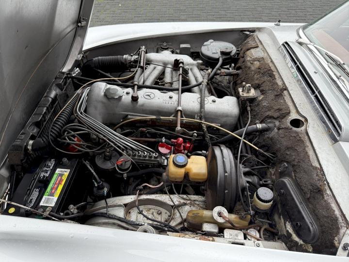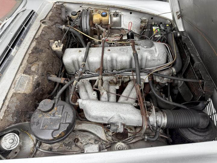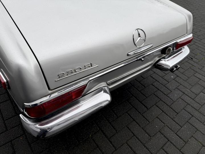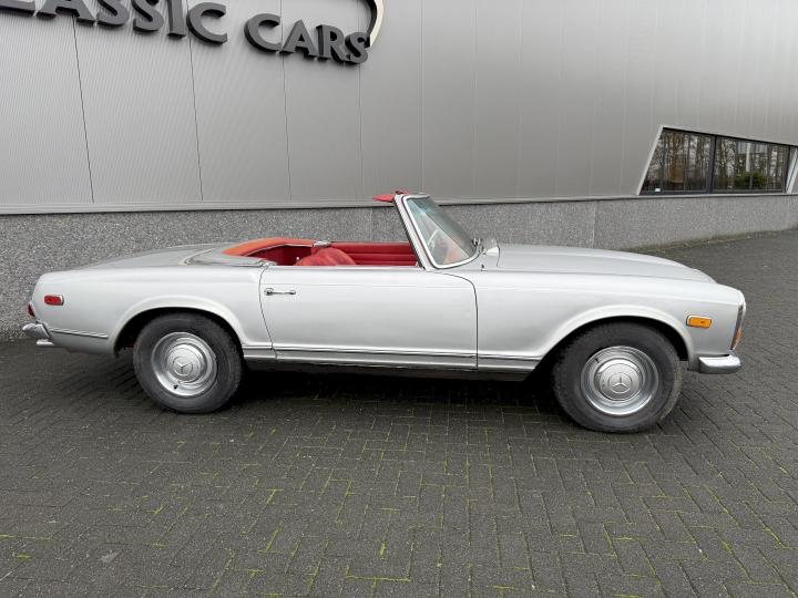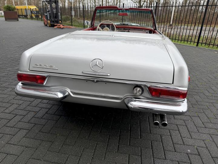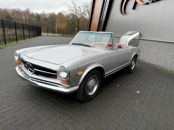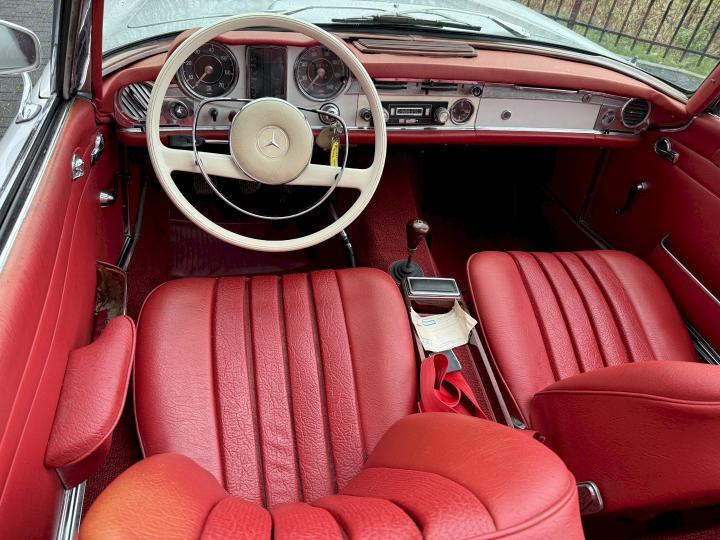 Matching nummer van origine Europese versie 230SL Pagode met 4 gang handschakeling, voorzien van hardtop en softtop, in het verleden naar Texas USA verkocht en voorzien van US versie koplampen en mijlenteller, leuke auto met een mooi rood leder interieur, dashboard hout is vernieuwd, qua body best redelijk goed en hoofdzakelijk origineel, het rechter voorscherm is in het verleden vernieuwd, motorisch en technisch in goede conditie.