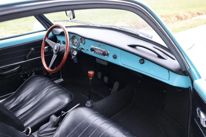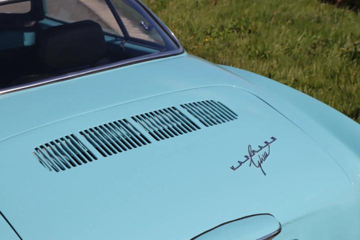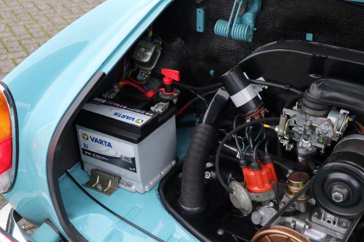 The car is in virtually the same condition as when it rolled off the production line in Osnabrück. It stands out in terms of the colour of the paintwork: this is a unique Aston Martin colour that is unique to this car. Both the paintwork and the chrome work, rubbers and rims are in very good to perfect condition. Naturally, the car is rust-free and the underside is in good condition. The interior features black (artificial) leather upholstery and a wooden Nardi steering wheel. A distinctive feature of the car is the lockable glove compartment. The interior has also been restored to its original condition and is in very good condition. The original radio is still present. Thanks to the rear seat, a total of four people can be seated. The boot (at the front) is also neat and tidy and has room for the spare wheel.