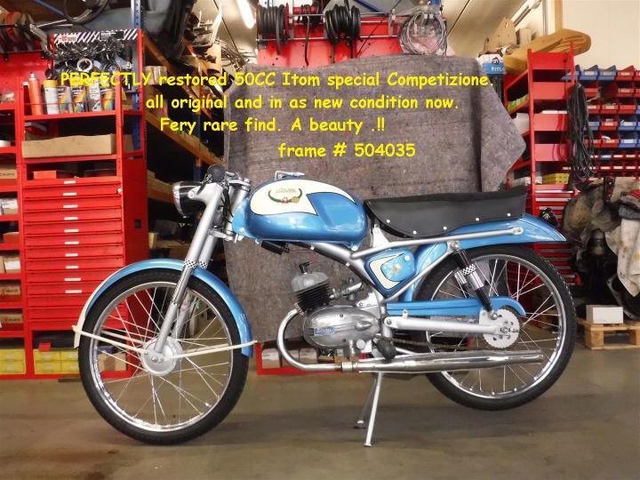 Perfect gerestaureerde 50CC itom Special Competizione. Alles is origineel en in nieuwe conditie. Een hele zeldzame vondst, fantastisch ! Grootste keus in ECHTE klassiekers met meer dan 450 stuks in de Stolze Collectie, van project tot perfect !